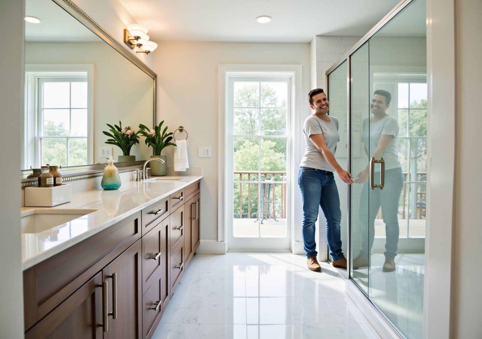 Use of Light: Large mirrors, glass shower doors, reflective finishes, and ample lighting visually expand tight quarters.